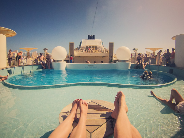 Ein ganzer Tag also, zum Entspannen, Lesen, am Pool liegen, Füße ins Wasser halten. Den eigentlich nicht so schwachen Wind bemerkt man nicht an Deck, weil das Schiff mit ähnlicher Geschwindigkeit in die gleiche Richtung fährt.