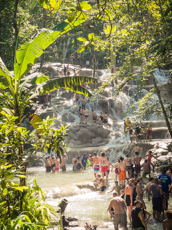 „Einfach hochgegangen?“ sagt der Amerikaner, der kurz nach uns zu mehreren Hundert den Strand am Fuß des Wasserfalls betritt. Das ist viel zu langweilig. Und zu unsozial. Deswegen wird sich unten im Kreis eingestimmt auf die „great experience“ „Hot, hot, HOT“, Und dann gehen alle in einer Kette — Hand in Hand — den Wasserfall hoch. Alle den exakt gleichen Weg. So kann auch nichts passieren.